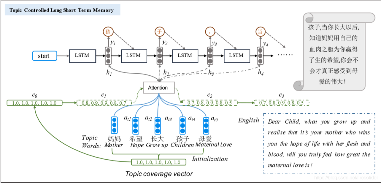 \[\alpha_{tj}=\frac {exp(g_{tj})} {\sum_{i=1}^{k}exp(g_{ti})}\] \[T_{t}=\sum_{j=1}^{k}\alpha_{tj}topic_{j}\] \[C_{t,j}=C_{t-1, j}-\frac {1} {\phi_{j}}\alpha_{t,j}\quad \alpha_{t,j}时刻t时topic_{j}的attention\ score\] \[\phi_{j}=N\cdot \sigma(U_{f}[T_{1},T_{2},...T_{k}])\quad U_{f}\in R^{kd_{w}},此处T_{i}代表topic\ embedding\]下一个词的预测概率: \(P(y_{t}|y_{t-1},T_{t},C_{t})=softmax(g(h_{t}))\ g(\cdot):linear \ function\)
